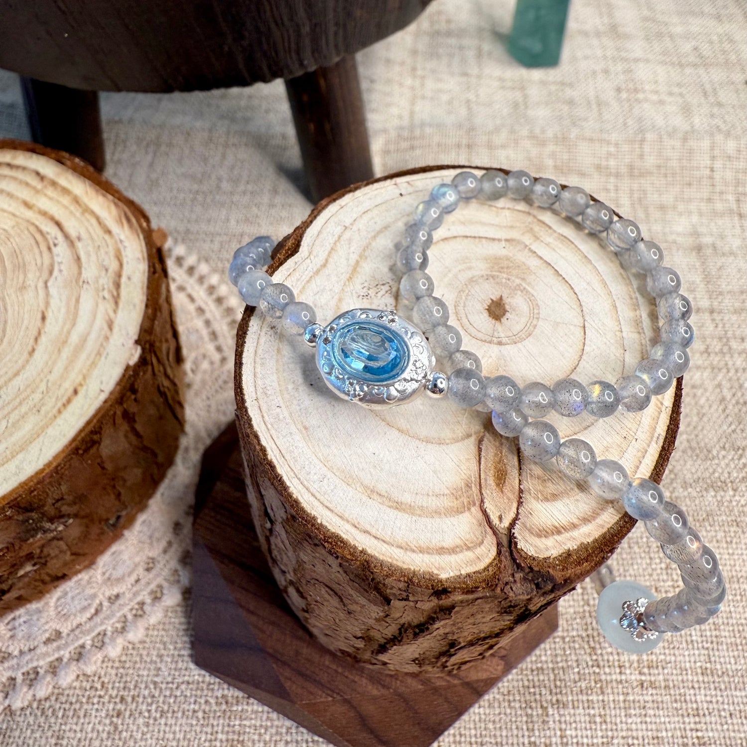Where lunar mysticism meets oceanic flow, this bracelet harmonizes 7mm gray moonstone beads with a sterling silver alloy "Double Gourd" charm housing an aquamarine core. Two alloy spacer beads engraved with Taoist cloud patterns flank the gourd, creating an energy vortex that balances yin receptivity (moonstone) with yang action (aquamarine). For those navigating life's tides, it's a portable altar for emotional alchemy and empowered communication.